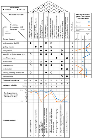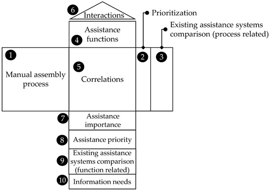 In the next step, a competitive comparison (values −2, −1, 0, 1, 2) of available assistance systems is made regarding their performance in terms of functionality (step 9, Figure 5). Positive ratings indicate good fulfillment of the required functions. In the last step, the specific information needs (work instructions, BOMs, drawings, etc.) for the worker can be defined for the specific assistance function defined (step 10, Figure 5).