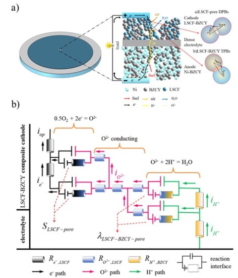 (a) Illustration of the electrochemical and physical coupling processes within a typical Ni-BZCY/BZCY/BZCY-LSCF PCFC button cell; (b) the corresponding equivalent circuit of e−, O2−, and H+ electric processes within the LSCF-BZCY composite cathode.