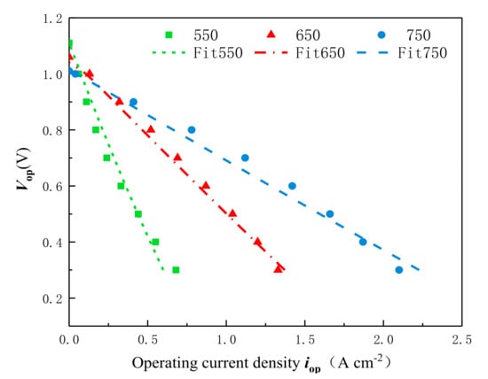 In Figure 2, the calculated iop-Vop curves at operating temperatures of 550, 650, and 750 °C are compared with the that obtained by experimental in Ref. [34]. iop and Vop are the operating electric current density and the corresponding output voltage, respectively. Good agreements between the simulated and experimental results in various temperatures verifies the validation of the established electrochemical and multi-physical coupling model.