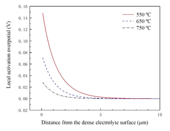 As can be seen from Figure 3, the cathode activation overpotential-c1 of O2 = 2O2− + 2e− increases with the decreasing temperature, and the electrochemical active region of the PCFC cathode increases gradually. At 550 °C, the oxygen reduction reaction occurring at the LSCF-pore DPB areas mainly occurs within 8 µm from the electrolyte surface. At the same time, similar results can be obtained for other output voltages. Therefore, for PCFCs using LSCF-BZCY 7/3 mixed cathode, the cathode thickness of 8 µm is sufficient to support most cathodic electrochemical reactions at intermediate operating temperatures. This result is reasonable. For most of the SOFCs working around 800 °C, the main cathode electrochemical active zones were found to be concentrated within 10 µm for both LSM-YSZ and LSCF-SDC composite cathodes [45,46]. For PCFC, when the working temperature decreases from 800 °C to 550 °C, the ionic conductivity greatly decreases and the electronic conductivity only slightly changes. Thus, the electrochemical active zone will be further compressed forward to the dense electrolyte direction for the minimal total energy loss.