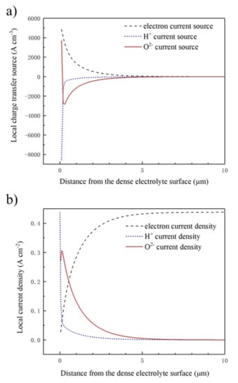 Under the working condition T = 550 °C and Vop = 0.5 V, Figure 4a further shows the distributions of the local e−, O2−, and H+ electric charge transfer source. The corresponding electric current densities in the PCFC cathode are also displayed in Figure 4b. Different from the cathode reaction of O2−-SOFC, oxygen ions in the composite cathode of PCFC are not generated at LSCF-pore DPBs and consumed at the LSCF-BZCY-pore TPBs. O2− is an intermediate transform substance between electrons and protons. Thus, there is a peak distribution within the composite cathode of PCFC. Since the electron conductivity in the LSCF-BZCY composite cathode is much higher than that of oxygen ions and protons, in order to achieve the minimal total energy loss of all physical transporting processes, the electrochemical active zones for the e−-O2− and O2−-H+ charge transfers are concentrated to a small distance away from the dense electrolyte. With the shortening of the distance from the electrolyte surface, the reaction between the protons and oxygen ions to produce steam becomes more intense, resulting in the rapid consumption of oxygen ion current, which makes the oxygen ion current in the cathode show a trend to first increase and then decrease.