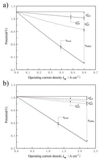 From Figure 5a,b, we can see that the proportion of the activation overpotentials is greatly increased, especially the activation overpotential of oxygen reduction half reaction in the cathode side of PCFC.