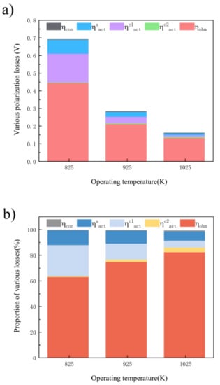 In Figure 5, the proportion of each polarization loss in the total voltage loss at 550 and 750 °C are shown. refers to the active overpotential of the anodic half reaction. and refer to the active overpotentials of the oxygen reduction half reaction and vapor generation reaction , respectively. includes the ohmic loss referring to the e−, H+, and O2− transports. is the concentration polarization of both cathode and anode. For the current anode support PCFC with an anode thickness of 500 µm and a cathode thickness of 25 µm, the concentration polarization loss of fuel-diffusing process within anode play the dominant role.