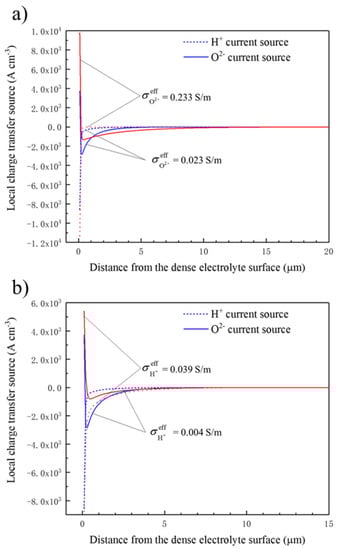 Generally, increasing the effective conductivity of the electrode can improve the performance of PCFC. Taking the PCFC with T = 550 °C and Vop = 0.5 V as an example, Figure 9 shows the dependences of the local oxygen ions and protons generation rates distributions on different ionic conductivities. As shown in Figure 9a, while is increased from 0.023 to 0.233 S m−1, the electrochemically active region for the O2− generation/consumption is expanded from 8 to 14 µm. While the H+ conductivity is raised from 0.004 to 0.039 S m−1, the active region for the H+ consumption is expanded from 3 to 6 µm. Obviously, the main cathodic electrochemical active zones are still concentrated within the 10 µm thickness area away from the dense electrolyte, and the electrochemical contribution of the extending zone is still negligible. This result is attributed to the larger electronic conductivity of composite cathode, compared with both the oxygen ionic and protonic conductivities at intermediate temperature zones.