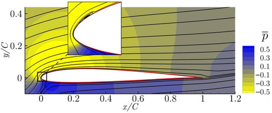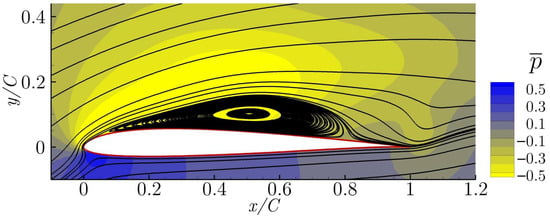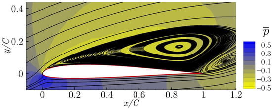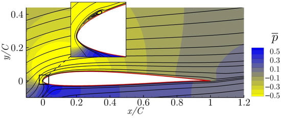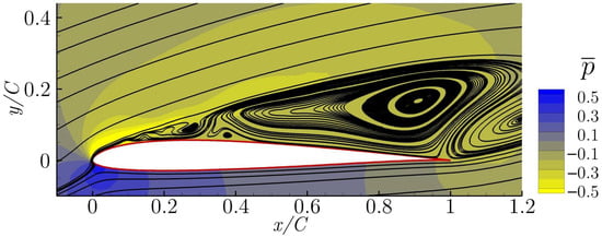 In Figure 3, the temporal averaged streamlines and pressure field for the non-actuated case is presented. This configuration is called the baseline. From the streamlines, it can be seen that the flow is fully separated and the airfoil is under stall conditions.