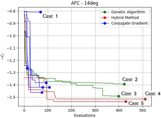 The Hybrid Method is the method that achieved better results, outperforming all runs of the other algorithms in both of its runs. During the first iterations, it achieved a convergence rate similar to the conjugate gradient. However, the improvement of the solution has continued, avoiding being trapped in any local minimum. It is also the most robust, as both runs are very similar in their performance. Both Hybrid Method runs outperformed all the other optimization methods with a and . One run of the Genetic Algorithm achieved a comparable solution (), but it took more than twice the computational cost of the Hybrid Method. Case 3, with a lift coefficient of , obtained by the Genetic Algorithm with around 375 objective function evaluations, improves the baseline lift coefficient by . Cases 4 and 5, obtained by the Hybrid Method runs, achieved a lift coefficient of and , respectively. Both runs needed around 125 objective function evaluations, which is the number of evaluations of case 3, with an increase in the lift coefficient of and , respectively, from the baseline. The best lift coefficient achieved by each optimization is presented in Table 4. The mean () and standard deviation () of the lift coefficient achieved by each optimization method is also presented. The Hybrid Method presents the best lift coefficient mean () followed by the Genetic Algorithm () and the conjugate gradient (). The conjugate gradient is the least robust, with a standard deviation of , but four of the six optimizations achieved similar results than the Genetic Algorithm with less computational effort.