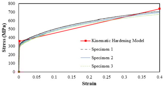 Based on the tensile test results, kinematic hardening model for this material was assumed as described in Figure 3. The material parameters were constituted with kinematic hardening modulus (c), equivalent stress in accordance with yield surface , back-stress , and equivalent plastic strain , as defined in Equation (1) [].