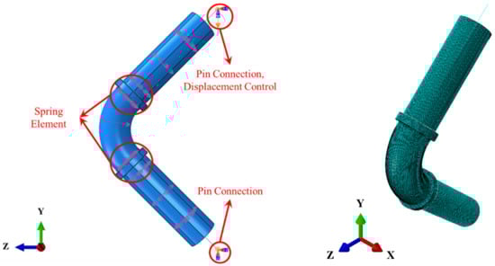 More specifically, a bilinear hardening plastic stress–strain curve corresponding to the kinematic hardening model was determined to describe the constitutive model of the elbow system, as shown in Figure 3. Finally, an FE model of the press-to-connect elbow system was constructed, and the jig condition was represented by a 2-node beam element (B31), while 4-node shell elements (S4R) were applied to establish the mechanical joint and straight pipe using the ABAQUS platform []. Considering the O-ring seals, the FE model of the elbow joint was simplified based on the spring element because of its extreme complexity and convergence difficulty of the simulation between the O-ring seals at the end of the pipe and mechanical pressing connectors. Figure 4 illustrates the FE model of the elbow joint and related boundary conditions.