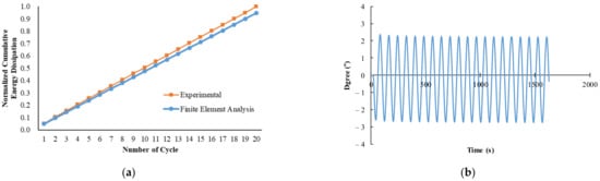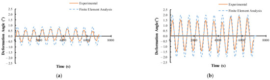 The maximum von Mises stress of the FE model in the piping system and the stress from the experimental test at the lower press-to-connect elbow were 187 and 205 MPa, respectively, at the 10th cycle during the loading condition. In addition, the observations from the upper elbow system, that is, the stresses of the FE model and experimental test, were 371 MPa and 403 MPa, respectively. In the case of the stress analysis, the error of the stress for the validation of the piping system model was less than 9%, which indicated that the FE model of the press-to-connect large-scale piping system using the ABAQUS platform [] was a high-principled model. In particular, during and after a strong earthquake, the seismic sway to validate the FE model with the more critical condition was also an important phenomenon in the structural and nonstructural components. Figure 11 illustrates the deformation angle of the two-elbow system obtained from experimental and analytical data. The deformation angle results of the experimental and analytical models were not significantly different. It can be observed that the high-fidelity simulation FE model was identical to the experimental test.