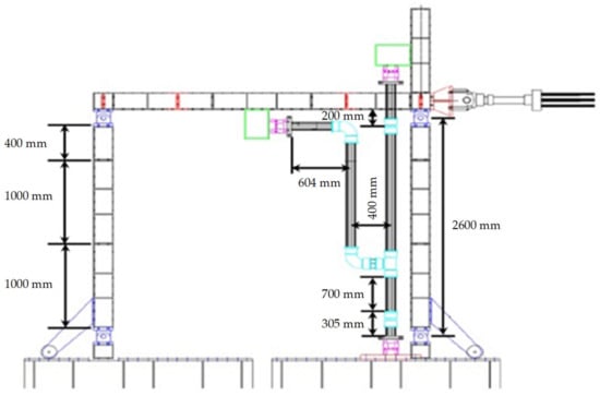 To evaluate the seismic performance of a large-scale piping system with a press-to-connect elbow system, an experimental test must be conducted. The common failure mode related to low-cycle fatigue or ground motion is concentrated at the elbow joints or T-joint systems in the piping system []. Therefore, in this study, a large-scale piping system with two press-to-connect elbow systems and one press-to-connect T-joint system with riser pipes based on NFPA 13 [] were constructed in this study. In addition, according to guideline NFPA 13 [], two flexible couplings, that is, sockets in the riser piping system, to absorb the energy of the vibration from the ground motion or other mechanical vibrations were installed within 610 mm from the upper bound (ceiling) and 305 mm from the lower bound (bottom floor), as shown in Figure 7.