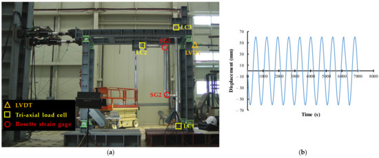 Moreover, the cyclic loading protocol based on displacement control was repeated 10 times or more to satisfy the maximum drift ratio of the building system corresponding to design codes KBC 2016 [] and IBC 2015 [], as listed in Table 1 and Table 2, where h and hxx denote the story heights for design codes KBC 2016 and IBC 2015, respectively.