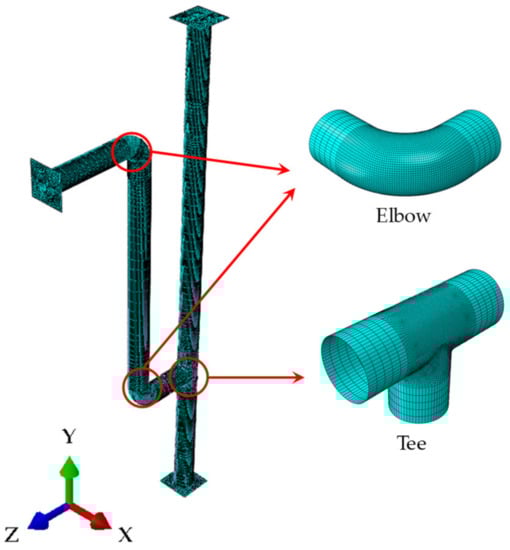 Experimental tests of large-scale piping systems are typically time-consuming and costly. To overcome these issues, it is necessary to develop a high-fidelity simulation model based on an experimental test to understand the in- or out-of-plane behavior of the piping system. Considering the material properties of the component-level test data, the bilinear kinematic hardening plasticity model as a nonlinear behavior material model was used to construct a high-fidelity FE simulation model of the large-scale piping system with a press-to-connect system. This large-scale piping system consisted of an upper elbow, a low elbow, a T-joint, and two flexible couplings to absorb energy from an earthquake. Based on the schematic design and experimental test of the piping system, a high-fidelity simulation FE model with the components was developed, and to allow seismic sway, the displacement and rotation in the z-direction were unfixed, as demonstrated in Figure 9.