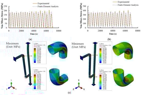 Validation of the von Mises stress of the large-scale press-to-connect piping system: (a) lower elbow; (b) upper elbow; (c) maximum and minimum stress distributions.