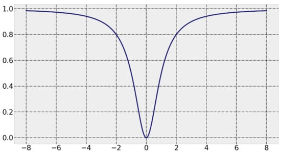 In this paper, a V-shaped [31] transfer function is used, and the function curve and expression are shown in Figure 1 and Equation (6), respectively, and Equation (7) is the particle position update formula. In these two equations, k represents the number of iterations, i and d represent the particle i and its dimension, respectively, and is a random number in the interval [0, 1]. represents the complement of , i.e., from 0 to 1 or from 1 to 0.