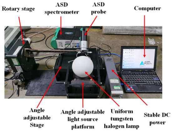 The experimental measurement instrument is a multi-angle spectral reflectance measurement system designed and manufactured by the research group. As shown in Figure 3, the light source incident angle of the measuring instrument can be adjusted in the range of 0–90°, and the detection angle can be adjusted in the range of 0–90°. The halogen tungsten lamp with a uniform light cover is used as the light source. ASD spectrometer and its optical fiber lens are used as the reflected light-receiving end. The rotary displacement table, the adjustable-angle stage, and the adjustable-angle light source platform are used as the position and angle adjustment mechanism. The computer is used as the data signal processing terminal. The grating dispersive spectrometer ASD (FieldSpec 3, Analytical Spectral Devices) has a detection range of 350–2500 nm, a minimum sampling interval of 1.4 nm, and a minimum spectral resolution of 3 nm. The spectral response range of the polarization module is 430–860 nm and 860–1650 nm.