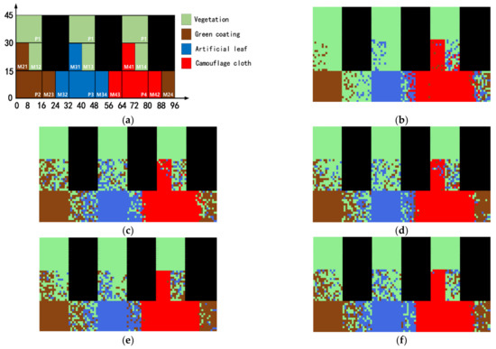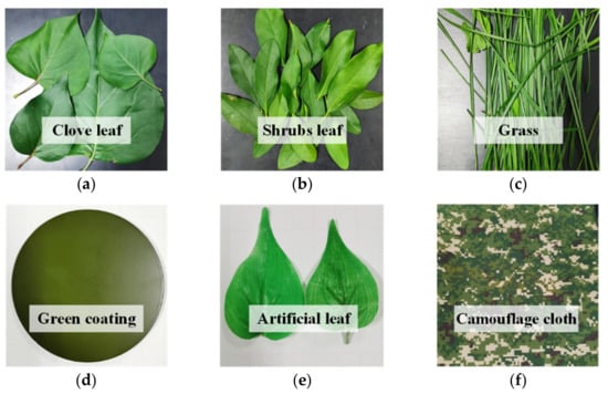 (a) Clove leaf; (b) shrub leaf; (c) grass; (d) green coating; (e) artificial leaf; (f) camouflage cloth.