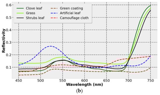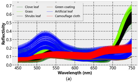 As shown in Figure 5a, the spectral numbers of the data samples of the same class show the same curve trend, but there are differences in the values within a certain range. The main reason is the variability of the sample material. For example, the camouflage cloth is composed of four kinds of color blocks (pigments), and the physical performance at different points of the sample is non-uniform, so the spectrum at different points of the same type of objects changes in amplitude. This results in the existence of different degrees of intersection between the spectra of ground objects. On the contrary, the spectrum of green coating with a single material and uniform spraying is very concentrated. Comparing the reflectance curves of the artificial object samples and the vegetation leaves, it can be found that the green artificial objects and the vegetation leaves are generally very similar in the visible light range, showing a lower reflectance spectrum and a reflection peak near 550 nm. After 700 nm, due to the red edge phenomenon of vegetation, the reflectivity of vegetation and human-made objects is significantly different. In practice, there are a large number of mixed pixels in HSIs. The existence of mixed pixels will further enhance the similarity between ground object samples.
