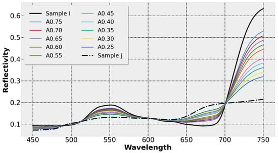 where is the pixel value of the mixed position on the image, is the abundance of the object sample i in the pixel , is the spectrum of the object sample i, is the spectrum of the ground object sample j, and e is the Gaussian noise. In this paper, is the hyperspectral reflectance of the sample measured by ASD. Figure 6 is a schematic diagram of the mixed reflectance of pixel i and pixel j. The pixel abundance is 0.75–0.25, and abundance changes in steps of 0.05.