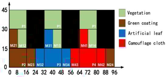 The research samples selected in the experiment are divided into two categories. The first class is vegetation leaf samples: clove leaves, shrub leaves and grass leaves. The second class is artificial objects similar to vegetation: green coatings, artificial leaves and cloth with camouflage patterns. The samples used for data acquisition are shown in Figure 4: all samples are similar in color and are green. Among them, clove leaves are large, heart-shaped, relatively flat, and smooth, and the leaves are overlapped. Shrub leaves are narrow and oval, curly, with smooth surfaces and overlapping leaves. The grass leaves are thin, narrow, long strip, rough surface, and the leaves are staggered. The surface of the green coating is flat and has a fine texture. The fake leaves are human-made, simulated landscapes, and their surfaces are rough and imitate the leaves’ grain. The camouflage cloth is green as a whole, composed of light green, dark green, brown and yellow.