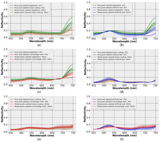 Spectral Characteristics of Hyperspectral Simulation Image Pixels (SNR = 1000): (a) vegetation and green coating; (b) vegetation and artificial leaves; (c) vegetation and camouflage cloth; (d) green coating and artificial leaves; (e) green coating and camouflage cloth; (f) artificial leaves and camouflage cloth.
