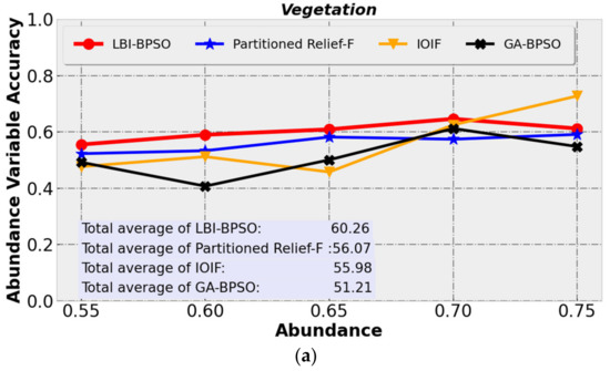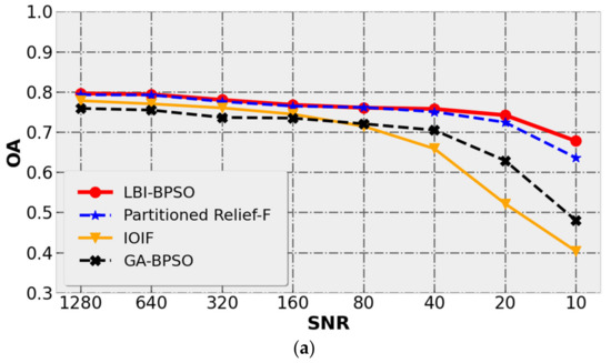 In sum, the comparison and analysis of the classification results for LBI-BPSO, Partitioned Relief-F, IOIF and GA-BPSO were completed for SNR conditions of 1000, different abundance conditions and different SNR conditions.