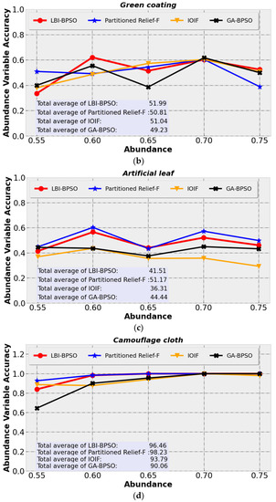 At the same time, the performance of LBI-BPSO and Partitioned Relief-F are relatively close in both AVA and TA. Interestingly, looking at Figure 12, it can be found that the accuracy is not positively correlated with the increase in the abundance of target objects. This is due to the similar color and material variability of the samples selected in this paper, and the partial spectra of various ground objects are close. There is, in addition, some high-abundance data obtained by mixing the spectra of the two types of ground objects by Equation (12) just show a higher similarity with the spectrum of the third type of ground objects, resulting in misclassification when the abundance is high. For example, Figure 12 shows that the green coating and artificial leaf did not increase AVA at an abundance of 0.75. Combined with the classification results in Figure 11c–e, it can be found that in the mixed areas M23 and M32 of green coating and artificial leaf, there are a large number of pixels in the area close to pure pixels that are classified as vegetation, resulting in a large number of classification noise.