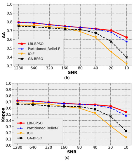 The fault tolerance to noise is an important index to test the performance of the algorithm. The following discusses the tolerance of the wavelengths selected by the LBI-BPSO, IOIF and GA-BPSO algorithms to noise. As shown in Figure 13, by adjusting the noise term e in Equation (12), the SNRs of the hyperspectral simulation data are gradually reduced from 1280 to 10 for a total of 8 different noise conditions. The values shown in the figure are the average accuracy of 10 repeated runs of the datasets with different SNRs. As described in Section 4.3, in order to compare the performance of different algorithms under the condition of low SNR more intuitively, the change of SNR is in the form of non-uniform step size. Table 4 shows the average and standard deviation of the classification result evaluation at the maximum (SNR = 1280), median (SNR = 160) and minimum (SNR = 10) SNRs, and the optimal value in the table is highlighted. in this table is the relative numerical difference of the evaluation corresponding to the SNR = 1280 and SNR = 10 conditions. can be calculated by Equation (15), and represent the evaluation at SNR = 1280 and SNR = 10, respectively. The smaller the , the smaller the difference in classification performance of the selected wavelength under the two noise conditions of SNR = 1280 and SNR = 10. Furthermore, the algorithm is less affected by noise. Therefore, can be used to evaluate the noise tolerance of the wavelength selected by the DR algorithm.