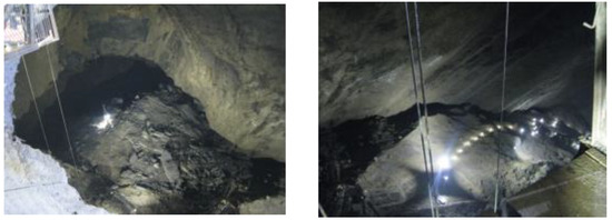 According to the investigation of the catchment area of the underground river, the total catchment area is about 85 km2, so F = 85 km2. The infiltration coefficient is taken to be for soluble rock: = 0.71 L/s km2. In order to calculate the most unfavorable situation, the historical daily maximum rainfall in Weixin County was taken, so that H = 132 mm (1 July 2008). With these parameters, Equation (1) was used to calculate the maximum water inflow of the underground river: = 8 × 106 m3/d = 92.6 m3/s.