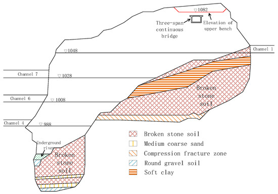 Figure 4, the karst cave was backfilled in five levels. The karst cave was backfilled step by step through channel 4 (988 m elevation), channel 6 (1008 m elevation), channel 7 (1028 m elevation), channel 1 (1048 m elevation) and the upper steps of the tunnel (about 1082 m elevation).