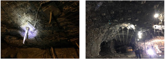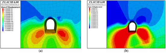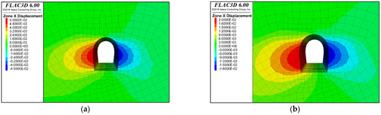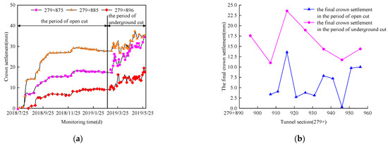 Figure 14b. The settlement range of the whole monitoring section is 0.3~13.6 mm and 4.4~15.2 mm, respectively. The crown settlement difference between sections is relatively large. Therefore, it is necessary to pay attention to the change in load caused by the change in surrounding rock stability and to strengthen the monitoring of the surrounding rock in different areas and carry out timely supplement grouting for reinforcement.