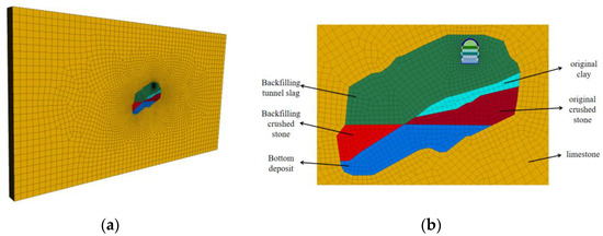 Figure 6b is the distribution diagram of surrounding rock in the karst cave. So that the tunnel width on both sides is five times that of the width of the karst cave, the calculation range of the model was set to be 50 m in the longitudinal direction, 1300 m in the transverse direction and 700 m in the vertical direction, including 270 m from the tunnel crown to the model top surface, 120 m from the tunnel bottom plate to the karst cave bottom and 400 m from the model bottom. The simulation range was relatively large, and a total of 1 million elements were generated. Only the upper surface is free; all other surfaces are constrained. Therefore, the surrounding and bottom boundaries were set to be impervious.