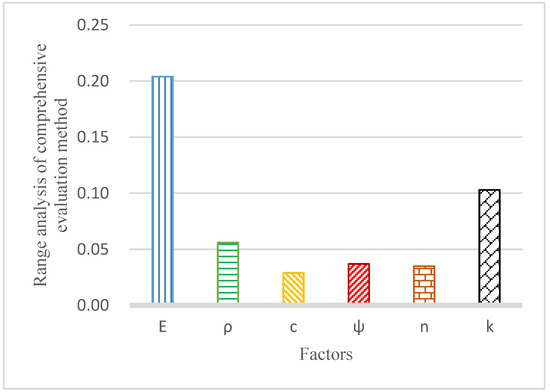 Table 5. When the crown settlement is taken as the index, the elastic modulus of backfill soil has the greatest influence, followed by the reduction coefficient of water on backfill, cohesion, porosity and density. The internal friction angle has the least influence. When the elastic modulus, density, cohesion, internal friction angle, porosity and water reduction coefficient are 1400 MPa, 2160 kg/m