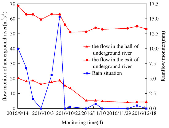 In order to achieve a clear understanding of the underground river flow, 130 m to the left of d3k279 + 938 and 70 m to the left of d3k279 + 970 were taken as observation sections in the underground river in the karst cave to observe and measure the flow in the tunnel. The statistics and the amount of rain on that day are plotted in