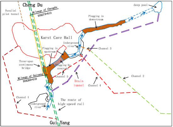In order to avoid the backfill blocking the underground river channel and adversely affecting the operation, the underground river in the karst cave section was diverted before the karst cave treatment, as shown in