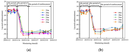 At the initial stage after backfilling, the backfill body of each layer is gradually consolidated under the action of self-weight and upper construction load, displacement fluctuating frequently within the range of 5~−10 mm (positive value indicates soil uplift).