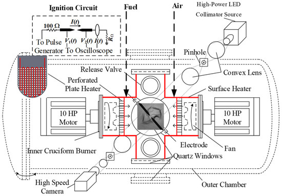 The experimental procedure used in the present work is the same as our previous studies; this will not be elaborated upon here, so the reader is directed to Refs. [23,27,28] for details. The outer safety chamber is pressurized with the dehumidified air at a pressure slightly higher than the initially selected pressure inside the inner cruciform burner. The inner cruciform burner is first vacuumed and then the appropriate mole fractions of n-butane and air are sequentially injected into the inner cruciform burner to 1 atm in this study using the partial pressure method. Next is the mixing of the lean n-butane/air mixture by counter-rotating two specially-designed fans and perforated plates (see Figure 1), where the two fans are rotated at a fixed fan frequency f = 30 Hz for at least 1.5 min to ensure the well mixing of fuel and air. For the laminar case, the two fans are turned off right after the mixing, and then we wait for about 10 s to let turbulence completely dissipate, allowing a quiescent mixture before ignition. As to turbulent cases, after the well mixing of fuel and air, the fan frequency is set to the desired value for the wanted u′ ≈ 0.0462f (ms−1), measured by high-speed particle image velocimetry (PIV) [22,26,29]. Additionally, the integral length scale of turbulence LI ≈ 10.7f0.34 (mm), leveled off to about 45 mm at high values of f ≥ 70 Hz [22,26,29].