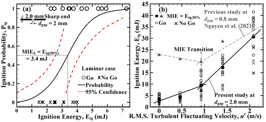 (a) A typical example for determining MIE at 50% ignitability (=Eig,50%) using the logistic regression method. (b) The present MIET data as a function of u′, showing a regular MIE transition occurring at a critical u′c ≈ 0.92 m/s. In addition, also plotted for comparison are previous data measured at small dgap = 0.8 mm for the same lean n-butane/air mixture, revealing an irregular MIE transition with TFI when u′ < u′c ≈ 0.92 m/s [24].