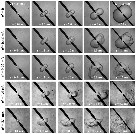 Figure 3 presents high-speed schlieren images for time evolutions of the early flame kernel development under laminar and turbulent conditions at five different values of u′ varying from 0 to 2.1 m/s, all for successful ignition events. The first four columns have a 24 × 24 mm2 view field to see the embryonic kernel development after the spark discharge; the fifth column has a larger view field of 42 × 42 mm2 for the observation of self-sustained flame propagation.