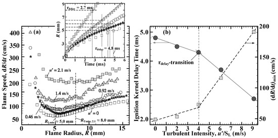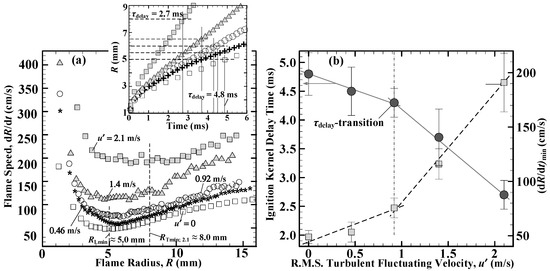 (a) Averaged flame speed plotted against flame radii at different turbulent fluctuating velocities (u′), obtained from the average flame radii versus time (the inset figure). (b) The ignition kernel delay time (τdelay) and minimum flame speed (dR/dt)min as a function of r.m.s turbulent fluctuating velocity u′.