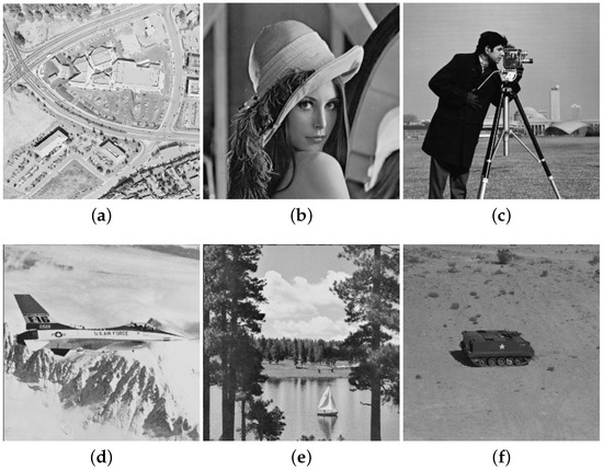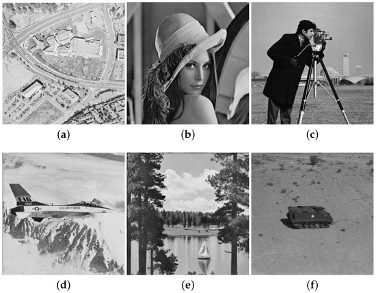 Original standard images. (a) aerial; (b) lena; (c) cameraman; (d) jet; (e) lake; (f) tank.