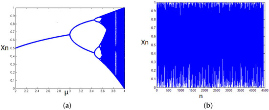 The logistic map is used to take advantage of chaotic functions’ pseudo-random nature. The bifurcation diagram of the function described in Equation (4) is used to determine its chaotic behavior, which is depicted in Figure 4a. This behavior can be seen when the control parameter . The quasi-uniformity of the invariant natural density of the logistic map, as shown in Figure 4b, confirms this.
