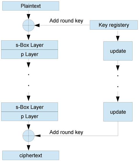 PRESENT [36] is a lightweight block cipher that consists of a substitution–permutation network [37]. The block size is 64 bits, and the key size is either 80 or 128 bits. The encryption is performed through 31 rounds. The flowchart of the working of PRESENT block cipher is shown in Figure 6.
