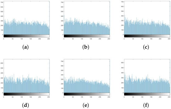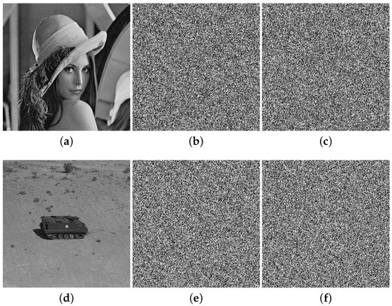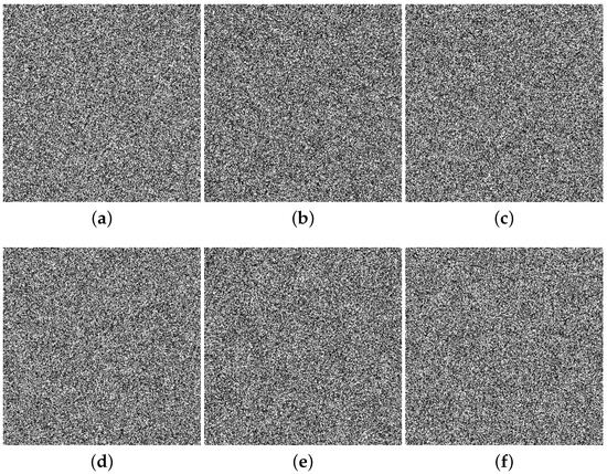 Result of encryption-procedure employed on standard images: (a) aerial; (b) lena; (c) cameraman; (d) jet; (e) lake; (f) tank.