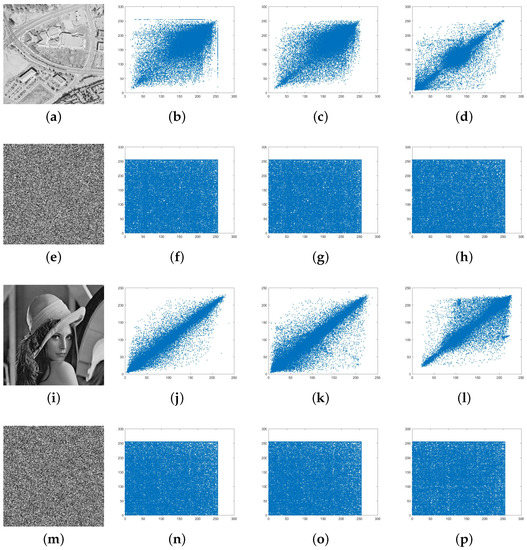 Correlation of neighboring pixels in plain and encrypted images: (a) aerial; (b) horizontal; (c) vertical; (d) diagonal; (e) encrypted aerial; (f) horizontal; (g) vertical; (h) diagonal; (i) lena; (j) horizontal; (k) vertical; (l) diagonal; (m) encrypted lena; (n) horizontal; (o) vertical; (p) diagonal.