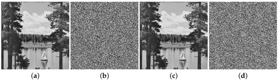 Plain image sensitivity: (a) lake; (b) encrypted lake; (c) lake SSIM = 0.9989; (d) encrypted lake.
