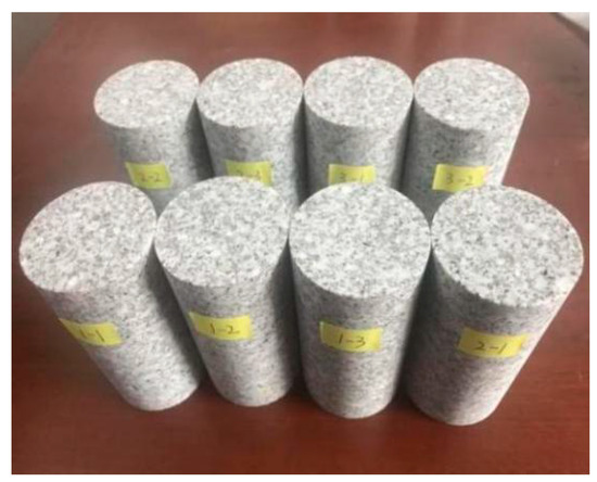 A complete crack-free granite block was extracted from an underground water-sealed storage cavern in Shandong province, China, and cylindrical rock samples with a diameter of 50 mm and an aspect ratio of 2 were obtained from this material. Some of the samples are shown in Figure 1. The stipulations of the Standards for Engineering Rock Mass Test Methods [34] were followed to ensure the representativeness and accuracy of each sample after processing.