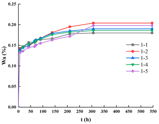 In the water absorption test, the sample mass and P-wave velocity did not change when the maximum free water absorption was reached. To avoid affecting the characteristics of the sample, a water absorption test was carried out without drying. The test results are shown in Figure 2. The trend of the water absorption curve of each sample was similar. Within 42 h, the free water absorption of the granite changed significantly, and the free water absorption, Wa, increased from 0% to 0.150%. Owing to the density of the granite, low porosity, and slow water absorption, the initial water absorption of the rock sample increased rapidly. With the increase in water content in the pores, the water absorption growth rate gradually slowed down. From 306 h to 546 h, the free water absorption of the rock samples was essentially unchanged. Therefore, the water absorption test was stopped after 546 h, when the granite samples had reached the maximum free water absorption.