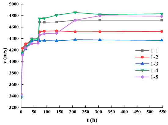 The test results of P-wave velocity are shown in Figure 3 and were between 3350 and 4850 m/s. In the initial 6 h, the P-wave velocity increased rapidly. It can be seen from the water absorption test that the water absorption rate also increased rapidly during this period. When the water content in the pores increased to a certain value, the water absorption capacity of the rock sample decreased but continued to increase slowly, along with a slow increase in P-wave velocity. After 210 h, the P-wave velocity gradually tended to stabilize; however, because the water absorption still had some fluctuation, the sample reached maximum free water absorption after 546 h.