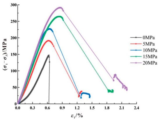 The typical differential stress-axial strain curves under different confining pressures are shown in Figure 5, where σ1 is axial stress, σ3 is confining pressure, (σ1–σ3) is differential stress, and ε1 is axial strain. The curves can be divided into the initial compaction stage (upper concave section), elastic deformation stage (straight line section), plastic deformation stage (non–linear section before peak value), and post-peak strain-softening stage. As the confining pressure increases, the initial compaction stage becomes smaller and smaller, indicating that the sample becomes denser under the action of confining pressure. With the increase in confining pressure, the plastic deformation stage before the peak becomes longer, indicating that the plastic properties of the sample are obvious with an increase in the confining pressure. The peak differential stress increases and the peak axial strain slightly increases with an increase in the confining pressure, indicating that an increase in the confining pressure makes the strength of the rock gradually increase.
