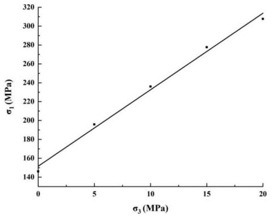 According to the Mohr–Coulomb strength criterion and the fitting of Equation (3) (m = 8.1, b = 151.6), the internal friction angle (φ = 51°) and cohesion (c = 26.84 MPa) were calculated.